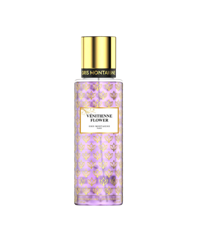 Brume Vénitienne Flower - Gris Montaigne est idéale pour ceux qui recherchent une brume florale complexe et élégante, mais avec une profondeur boisée et ambrée qui ajoute une touche de sophistication. Son mélange de bergamote fraîche, de rose opulente, de muscs blancs délicats, et de bois de manuka mystique en fait une fragrance idéale pour des occasions spéciales ou pour ajouter une touche de luxe à votre quotidien.