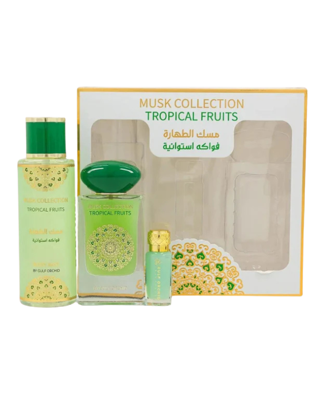 Le Coffret Tropical Fruits – Musk Collection vous invite à un voyage sensoriel vibrant et exotique. Ce coffret s'ouvre sur des notes de tête fruitées et d'agrumes pétillants, qui apportent une explosion de fraîcheur ensoleillée dès la première vaporisation. Au cœur, des accords de musc délicat se mêlent aux nuances florales de rose et de violette, créant une harmonie subtile et raffinée qui évoque la douceur d'un jardin tropical. En fond, le musc et l'ambre ajoutent une chaleur envoûtante et un sillage sensuel, laissant une empreinte douce et persistante sur la peau.