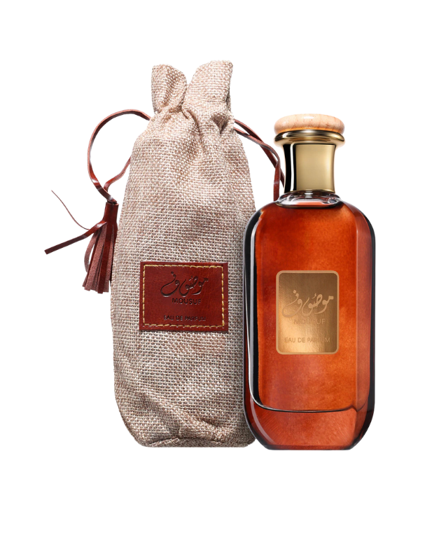 Dès l’ouverture, Mousuf séduit par un accord gourmand et audacieux de raisin juteux et de chocolat fondant, offrant un départ original et raffiné. Le cœur dévoile une puissance orientale avec un mélange sensuel de musc et d’oud profond, signature d’élégance masculine. En fond, la chaleur du toffee caramélisé, du tabac corsé et de subtiles notes florales vient envelopper la peau d’un sillage riche et irrésistible.